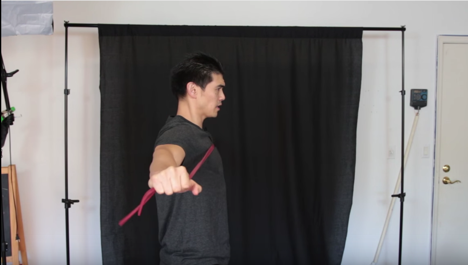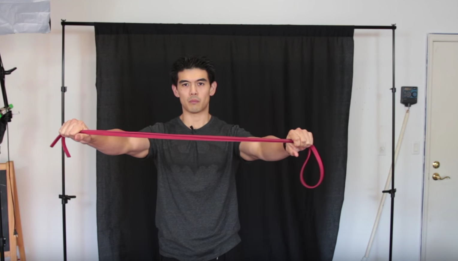 We’ll first begin with a simple exercise using an elastic. Grab the ends of each band and bring both arms forward and in front of you. Once you achieved this position, pull each band in the opposite direction creating a T like position. Retain this position for a few seconds and slowly come back to the first position.