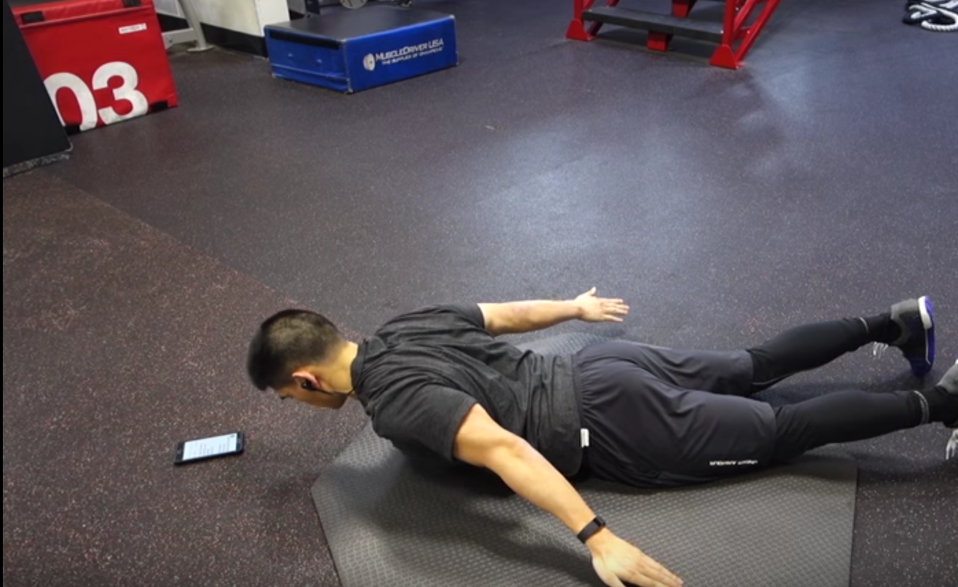For this exercise, you will remain on the floor, facing the ground. Stay in a slight T position ( arms slightly lowered) and raise your body and arms to squeeze your shoulder blades together. To variate the exercise, lower your arms nearer to your waist.